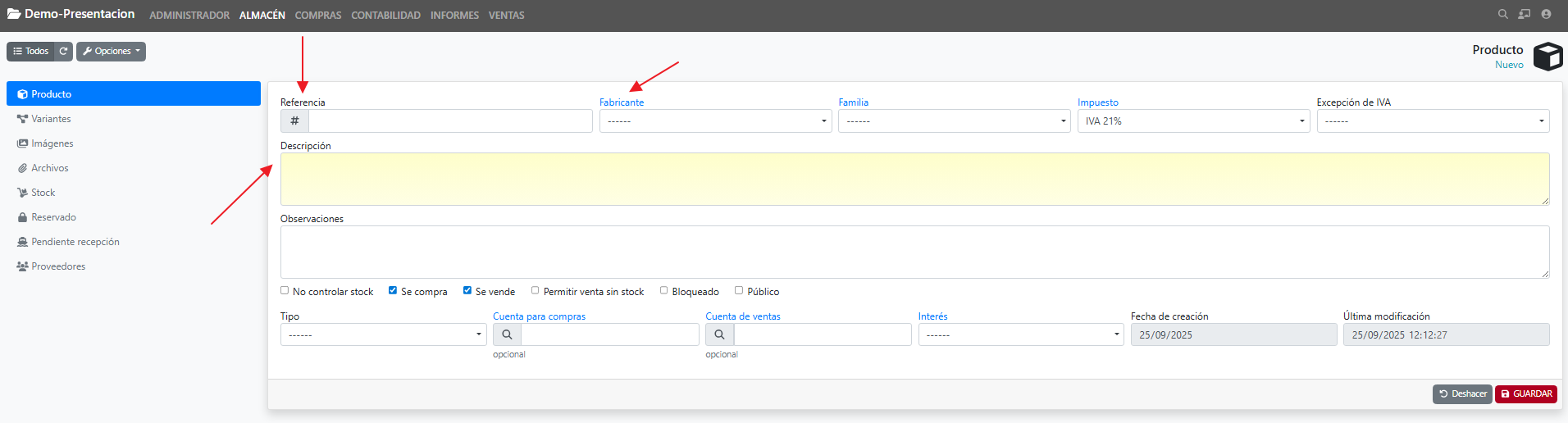 Estos campos son opcionales. Familia te permite clasificar productos en grupos (como «Material de Oficina» o «Consultoría»). Esto ayuda a organizar y filtrar tu catálogo. Fabricante se utiliza para indicar la marca o el proveedor (por ejemplo, «Dell» o «Servicios Globales»). Puedes elegir una opción de la lista si ya existen fabricantes registrados, o crear uno nuevo directamente. No es obligatorio completar estos datos; puedes dejarlos sin información.