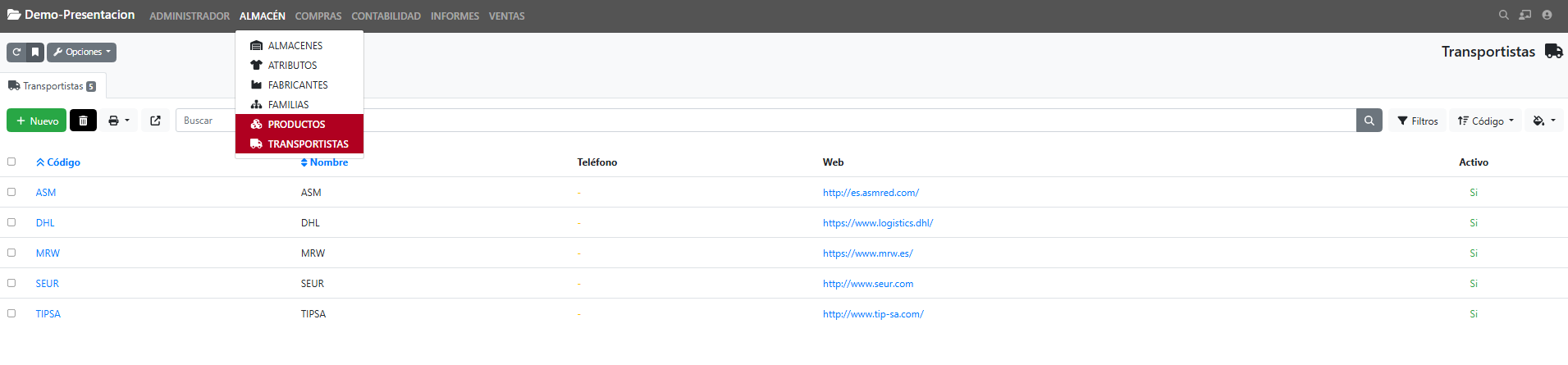 Dirígete a la sección Almacén → Productos. Se mostrará el catálogo completo de tu empresa, con información como Referencia, Descripción, Stock y Precio. Si acabas de empezar, es probable que la lista se encuentre vacía o solo contenga artículos de ejemplo.