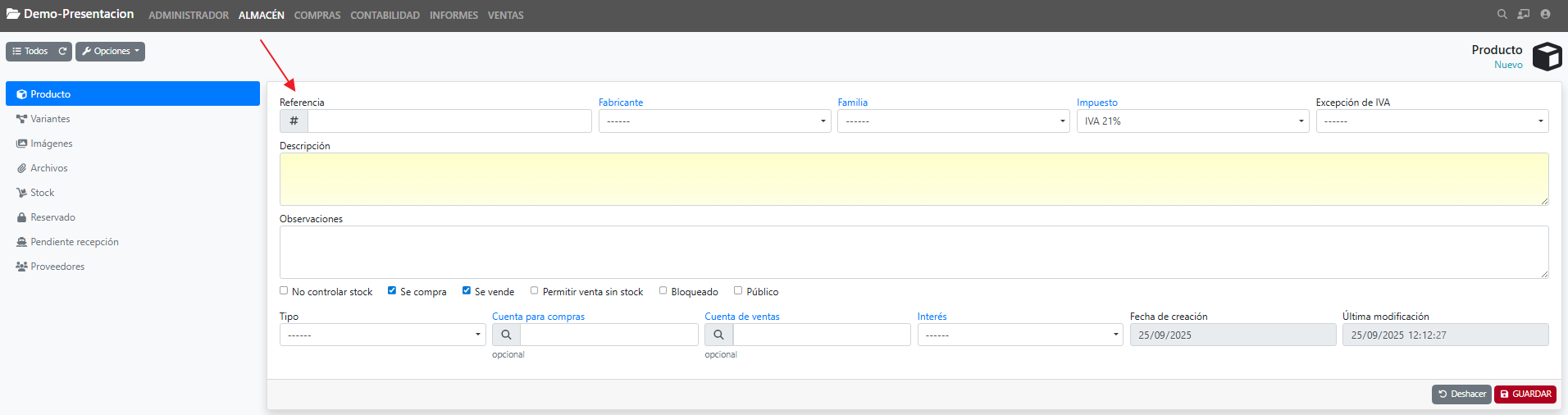 De manera opcional, puedes asignar una Referencia o código único al artículo. Si tu negocio utiliza un sistema de códigos o SKU internos, este es el espacio para registrarlo. Si optas por dejar el campo vacío, el programa creará automáticamente una referencia numérica en orden secuencial. Por ejemplo, asignaría «1001» al primer producto, «1002» al siguiente, y continuaría de esta forma.
