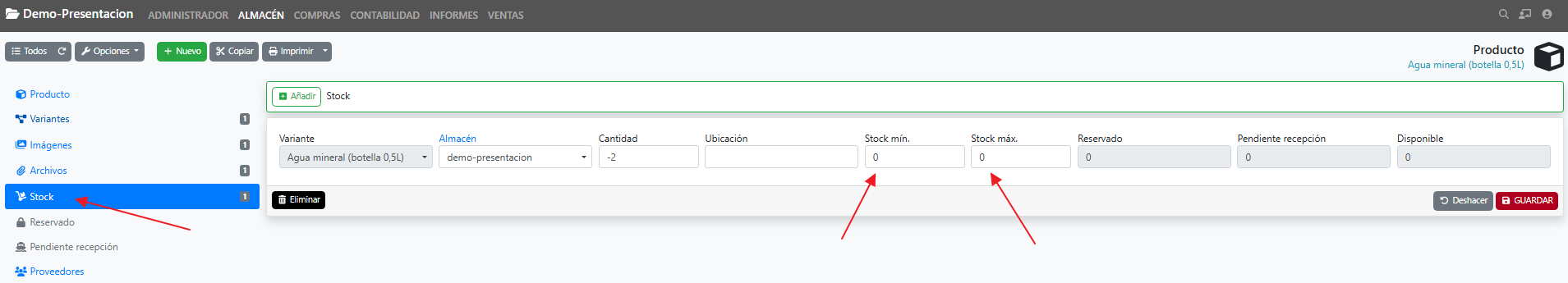 Stock actual: Encontrarás un campo para indicar la cantidad disponible en el almacén. Al crear un producto de forma manual, normalmente aparecerá en 0 (a menos que quieras establecer un stock inicial). Puedes mantenerlo en 0 por ahora; este valor se actualizará cuando realices operaciones de compra o ajustes de inventario.
