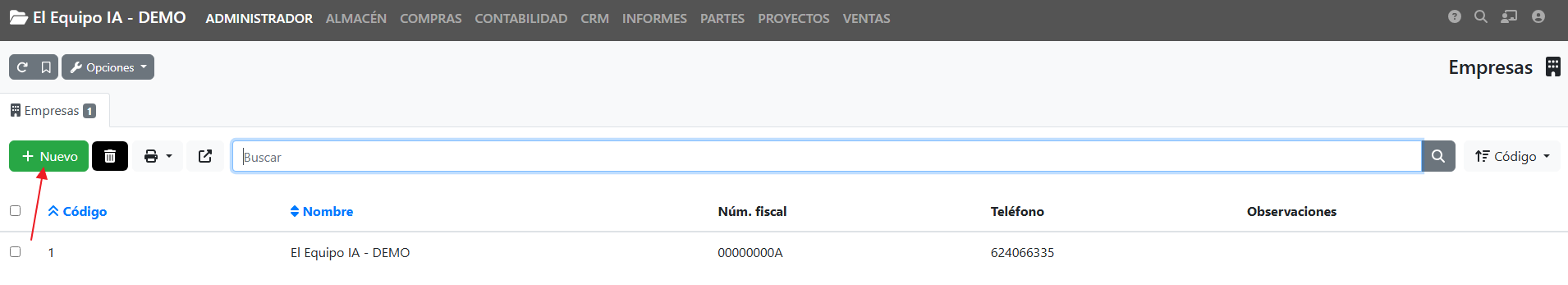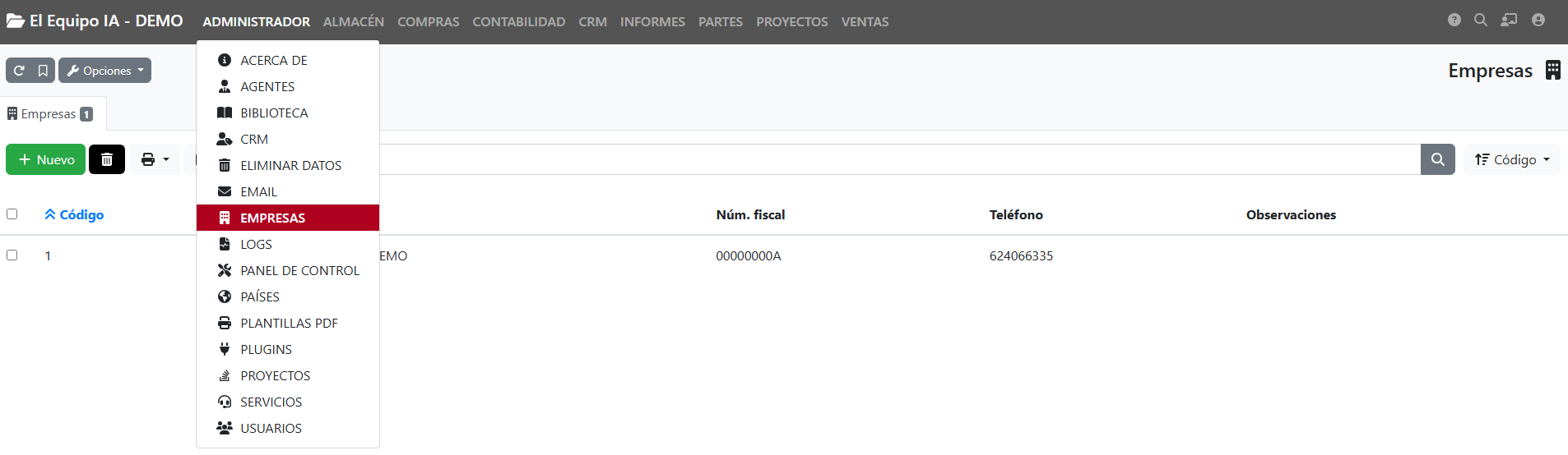 Inicia sesión en ElequipoIA y navega al menú Administrador → Empresas. Desde este panel podrás visualizar el listado de empresas existentes (normalmente comenzarás con una empresa predeterminada) y gestionar nuevos registros empresariales.