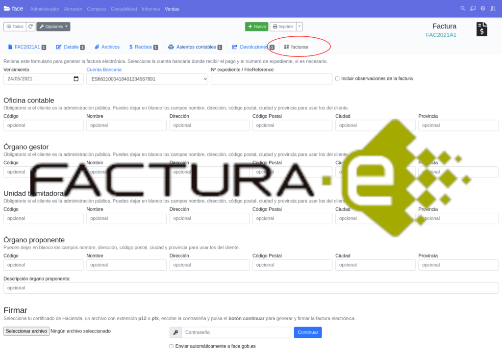 Este complemento añade la pestaña «Facturae» a las facturas de cliente. Desde esta pestaña puede rellenar todos los campos necesarios para la administración pública, como la oficina contable, el órgano gestor, la unidad tramitadora y el órgano proponente. Una vez completado el formulario, puede seleccionar su certificado digital, introducir la contraseña y firmar electrónicamente la factura.