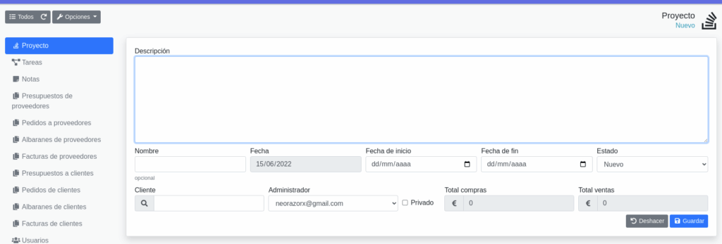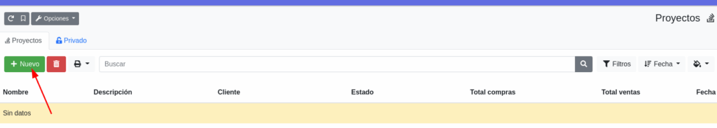 - Estado: configurable desde el menú Administrador, bajo Proyectos.