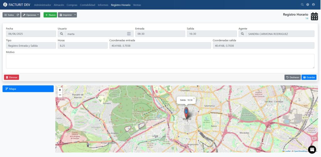 Entre sus funciones clave destaca la geolocalización integrada, que registra las coordenadas exactas de cada fichaje -tanto al inicio como al final de la jornada-. Todos estos puntos se visualizan en un mapa interactivo que utiliza iconos diferenciados para entradas y salidas, facilitando la identificación de cada registro.