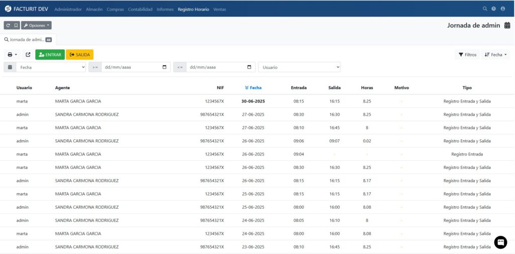 Los usuarios con permisos avanzados acceden a todos los registros, disponen de opciones de filtrado y pueden exportar informes detallados de asistencia adaptados a las necesidades de la empresa.