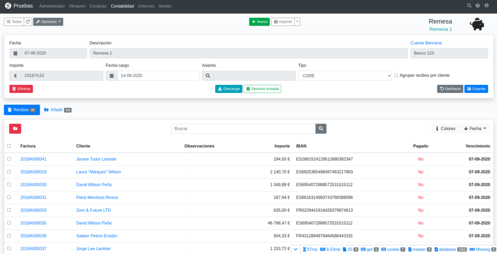 Incorpora la administración de Remesas bancarias en los formatos SEPA CORE, COR1 y B2B. Con este complemento podemos agrupar fácilmente los recibos pendientes de facturas de cliente en remesas, generar el archivo XML y enviarlo al banco.